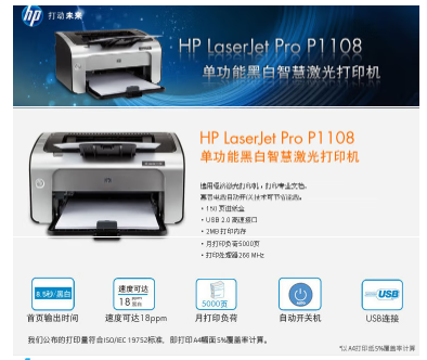 參數 [商品名稱] 惠普(HP)P1108 [最大支持幅面] A4 [打印速度] 18頁/分 [品牌] 惠普(HP) [型號] P1108